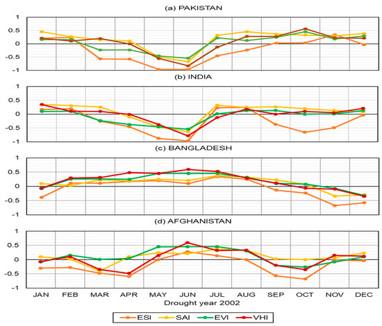 Figure 4 shows significant variations in the spatial distribution of ESI from 2002 to 2019, which is an important drought indicator. Low and high values of ESI represent more and less drought-affected areas, respectively. The spatial maps exposed severe drought conditions in 2002 over the study region, having a low ESI value of −3.165. The drought year, 2002, was considered further for comprehensive details regarding drought months, drought-affected regions, comparisons of drought indices, and their relationship with climate variables and crop yield data in each country. Presently, it is much more difficult to know about the compensation that drought has caused. Therefore, the areas affected by drought were identified.
