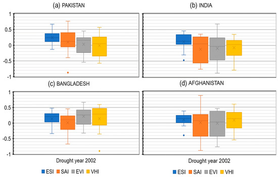 (a–d) Boxplots presenting the range of agricultural drought severity over the study region based on the ESI, SAI, EVI, and VHI estimation during 2002, the drought year. The solid grey lines in the box show the median and the cross sign indicates mean.