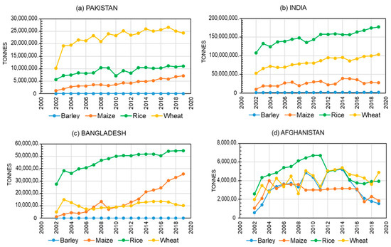 National annual barley, maize, rice, and wheat production data for Pakistan, India, Bangladesh, and Afghanistan were downloaded from the Food and Agricultural Organization (FAO) for the period 2002–2019. Although this dataset has abundant quality measures, there still is some level of uncertainty. Even, with these uncertainties, this dataset is still considered the most reliable and readily accessible data [37].