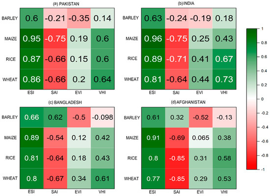(a–d) The correlation coefficient matrix between the drought indices and crop yield anomaly index (YAI) in Pakistan, India, Bangladesh, and Afghanistan during 2002, the drought year.