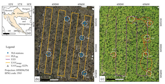 The study area. (a) The location of the study area in Croatia; (b) leaf-off condition orthophoto from UAVimage dataset, unmanned aerial vehicle photogrammetry (UAVimage) trajectory and terrestrial laser scanning (TLS) stations; (c) unmanned aerial vehicle laser scanning (ULS) and handheld personal laser scanning (PLShh) trajectory on the leaf-on orthophoto produced from ULS onboard camera. Plot boundaries are represented by white circles in figure (b,c).
