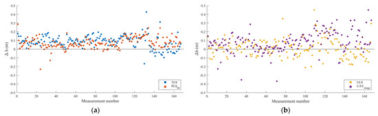 Height discrepancies from reference data. (a) For PLShh and TLS; (b) For UAVimage and ULS.