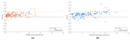 Height discrepancies with respect to distance from (a) PLShh trajectory and (b) TLS stations.