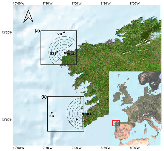 Northwestern coast of Galicia (NW Spain) with Vilán (a) and Silleiro (b) areas of study. The following data sources are indicated in the figure: VB: Vilano-Sisargas buoy; VILA: Vilán HF radar and range cells of width of 5 km (RCs); S28: SIMAR (Marine Simulation) point 3004028; SB: Silleiro buoy; SILL: Silleiro HF radar and range cells; and S68: SIMAR point 1044068.