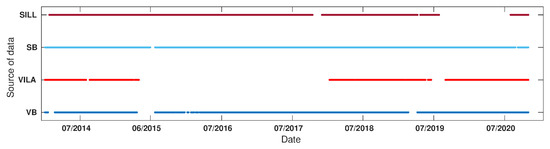 The data period used for this work spans from 1 January 2014 to 7 October 2020. Data availability is a limitation factor on radars and buoys since the SIMAR data series are only missing a few days and the WW3 data series is considered complete. For the radars, the lack of data was due to problems in the operation or adjustments of their installation, and in the case of the buoys, mainly due to maintenance periods. Although there are abundant gaps during small periods of time (around hours or days), there are also others that span from months to years, as is the case of VILA and SILL data series (Figure 2).