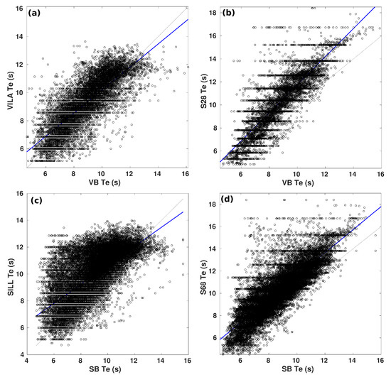 scatter plots of Vilano-Sisargas buoy (VB) vs. Vilán radar (VILA) (a), and SIMAR S28 (b); and Silleiro buoy (SB) vs. Silleiro radar (SILL) (c) and SIMAR S68 (d). Blue lines correspond to the best data linear fitting.