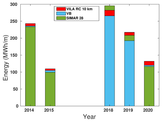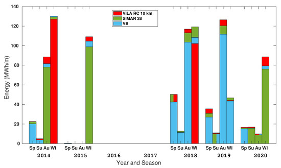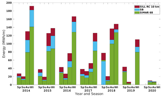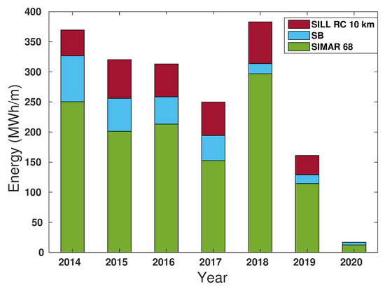 The wave energy calculated with the SILL radar is always larger than that estimated with its corresponding buoy and SIMAR point (Figure 6) and the highest overestimation seems to occur in winter (Figure 7). However, the wave power validation (Table 5) shows that the largest SILL overestimation occurs in spring and summer. Except in spring 2018, the energy estimated with the S68 point data is always lower than that estimated with SILL and SB. This is also confirmed by the mean wave power comparison (Table 5).