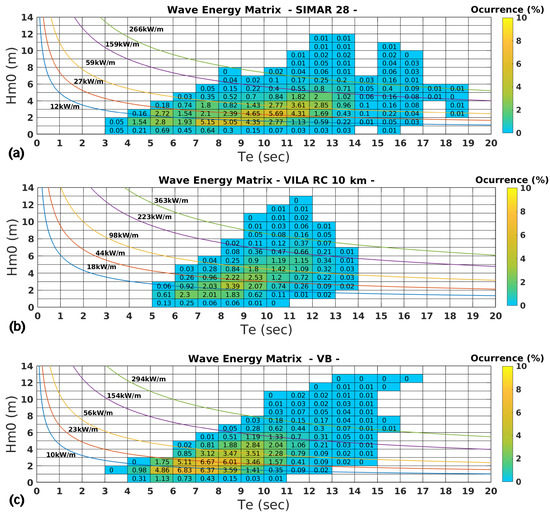 In addition, the matrices of the Vilán area (Figure 8a–c) revealed that while the values of VB increase progressively until their maximum value at s, for the VILA matrix (b), the maximum of is obtained for s and a slightly higher percentage of occurrence for values between 5 and 8 m. On the other hand, S28 matrix (a) shows relevant differences compared to VILA and VB matrices, such as the extension of the distribution 3–19 s and the significant bias of the percentage of occurrence towards larger periods but with a smaller .