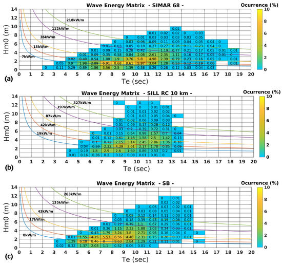 The analysis of the Silleiro area (Figure 9a–c) shows that the SILL matrix has higher percentages of occurrence between 11 and 13 s and for m compared to the SB matrix. The S68 matrix distribution of the percentages of occurrence also shifted towards higher values of , but they are lower for m and do not reach the maximum of SB and SILL (12 m). This is clearly reflected in the lower values of S68 percentile power lines.