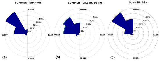 In the Silleiro area, although the predominance of the NW swell is also maintained during summer, both the buoy and the radar describe an increase in the percentage of North wave directions (–), while the SIMAR point does not show significant values with that direction (Figure 11).