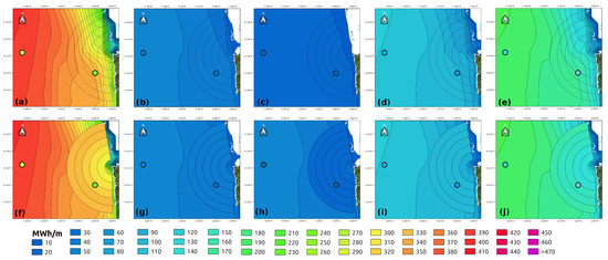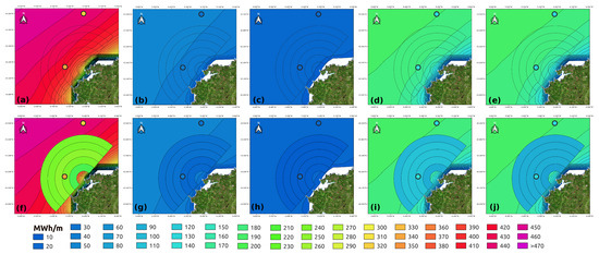 Mean annual and seasonal wave energy for the Vilán site. From left to right, the annual (a); spring (b); summer (c); autumn (d); and winter (e) seasonal wave energy is shown for the WW3 model. S28 and VB values are shown within small circles, and radar range cells values are only shown for comparison in the lower row (f–j).
