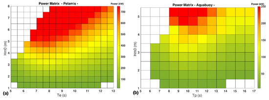 The method used to estimate the electrical output from a WEC device consisted of summing the result of multiplying the WEC power matrix by an hour’s occurrence matrix, like those described above [32]. The power matrix represents the electrical power (W) that the WEC can generate for each cell ( vs. or ). These usually have significant restrictions regarding minimum and maximum and T values, considering their technology or their own safety [3]. For this work, power matrices were generated for Pelamis and Aquabuoy engines, based on data previously published [13,73].
