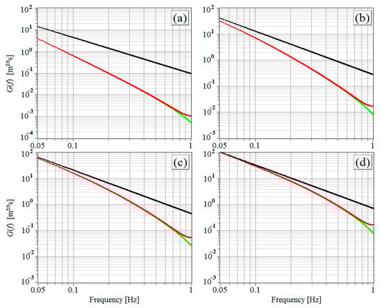 Fitting functions (black curves), (green curves), and (red curves) at the mean wind velocity = 1 m/s (a), 5 m/s (b), 10 m/s (c), and 20 m/s (d).