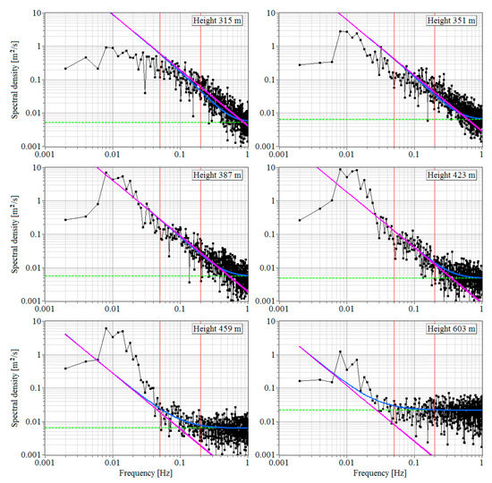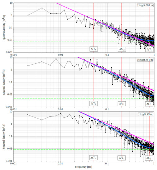 Experimental spectral density of the radial velocity at heights of 99 m, 351 m, and 603 m (black curves) and the noise component (green dashed line). Measurements from 08:42 to 09:12 local time (UTC/GMT+7) on 28 June 2020. The blue and pink curves are for calculated spectra and , respectively.