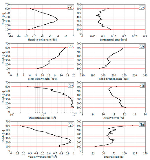 Figure 3 shows the vertical profiles of the signal-to-noise ratio , instrumental error , the mean velocity , and direction angle of the wind, the turbulent energy dissipation rate , the relative error of estimation of the dissipation rate , the variance , and the longitudinal integral correlation scale of the vertical component of wind velocity vector as calculated from data of lidar measurements on 28 June 2020 from 08:42 to 09:12 LT. Red lines mark the heights for the spectra in Figure 2.