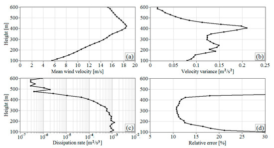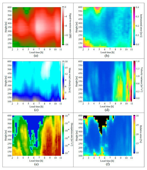 In Figure 4f, the zones where the relative error of lidar estimation of the dissipation rate exceeded 30% are colored in black. For only a small part of the dissipation rate estimates with such a high error, the instrumental error (Figure 4b) was also high. For the most part of the black zone in Figure 4f, the instrumental error ranged within 0.15 m/s >> 0.05 m/s. The main reason for estimating the dissipation rate with the error higher than 30% is extremely weak turbulence at this time, 10−6 m2/s3 (see Figure 4e).