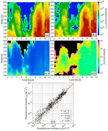 Figure 5a,c reproduces the distributions of and from Figure 4, while Figure 5b,d depicts the similar distributions of the estimates obtained by the method [14,18] and their relative errors . For quantitative comparison of and in Figure 5e, we used only the estimates whose errors and in each pair did not exceed 30%. There are 1250 such pairs in Figure 5e. From the data in Figure 5e, we find that the correlation coefficient between and is 0.963, and the coefficients of linear regression are = 0.974 and = −0.082 (, where and ). The red line in Figure 5e is . The comparison of the estimates and obtained from lidar measurements in other measurement days gives similar results. This means that the estimate of the dissipation rate by the method described in Section 3 is nearly unbiased.