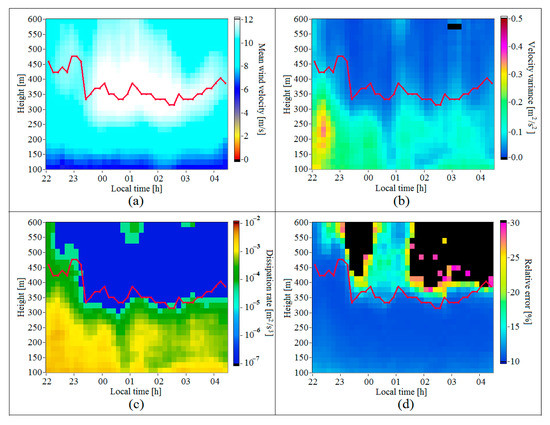 Height–temporal distributions of the mean wind velocity (a), variance of the vertical component of the wind velocity vector (b), turbulent energy dissipation rate (c), and relative error of lidar estimation of the dissipation rate (d) starting from 21:45 LT on 10 July 2020. The red curve shows the time series of the height of the maximum of mean velocity.