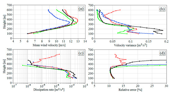 Vertical profiles of the mean wind velocity (a), variance of the vertical component of the wind velocity vector (b), turbulent energy dissipation rate (c), and relative error of lidar estimation of the dissipation rate (d) at 00:00 (black curves), 01:00 (red curves), 02:00 (green curves), and 03:00 LT (blue curves) on 11 July 2020. Data are taken from Figure 6.