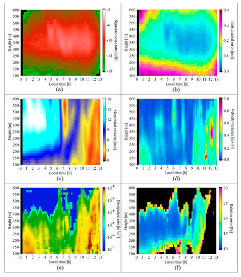 Height–temporal distributions of the signal-to-noise ratio (a), instrumental error of estimation of the radial velocity (b), mean wind velocity (c), variance of the vertical component of wind velocity vector (d), turbulent energy dissipation rate (e), and relative error of lidar estimation of the dissipation rate (f). Data obtained on 2 July 2020.