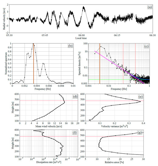 Figure 11 shows the vertical profiles of the mean wind velocity, variance of the vertical component of wind velocity vector, turbulence energy dissipation rate, and relative error of dissipation rate estimation obtained from the same lidar measurements as the spectra shown in Figure 10. One can observe from Figure 11a that the velocity is maximal at a height of about 400 m. The variance of vertical velocity (Figure 11b) first increases up to the height of the velocity maximum at the center of the jet and then decreases. The dissipation rate remains nearly constant up to a height of 300 m. Then, it begins to decrease and drops sharply by two orders of magnitude between 400 and 470 m in the top of the jet. Simultaneously, in accordance with Equation (A26), the estimation error also sharply increases. The increase of the variance is reasoned by the impact of IGW causing velocity oscillations, as stated above, with the frequency 0.01 Hz and considerable increase of the spectral amplitude in the frequency range 0.002 Hz 0.05 Hz (Figure 10). The variance is the integral of the spectrum (2) over the entire frequency range 0.002 Hz 1 Hz, and the presence of a peak in the spectrum at a frequency of 0.01 Hz leads to its increase. The dissipation rate is calculated from the spectra in the frequency range 0.05 Hz 0.2 Hz (see Figure 10), where the impact of the IGW is negligibly small, and there is no overestimation of .