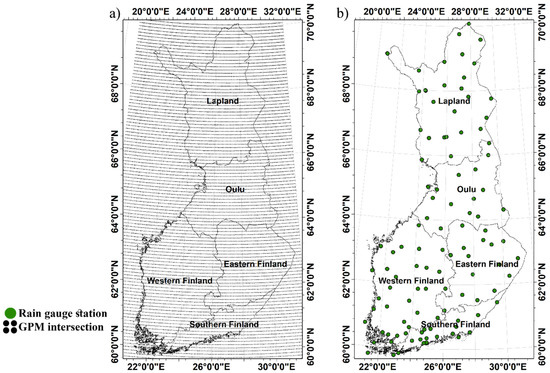 (a) GPM satellite intersections/grids over Finland. (b) Finland historical districts and distribution of FMI rain-gauge stations.