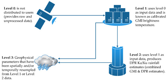 GPM SPPs range from raw non-distributed data to high-resolution processed precipitation data. NASA is the data provider and classifies the data into four levels of 0–3 (Figure 3). They recommend the level-3 SPP data for research purposes, which is produced with the Day-1 IMERG algorithm. The advantage of this algorithm is its capability to merge, incorporate, and intercalibrate all microwave and infrared (IR) satellite estimates, all other estimators from the TRMM satellite era, and ground measurements of the precipitation [23,59]. The resultant algorithm has high temporal (half-hourly) and spatial (11 km × 11 km) resolutions. The IMERG algorithm generates three primary SPPs: near-real-time (early and late runs) and post-real-time/calibrated (final run). The final run product is calibrated using GPCC data, which include data from ground stations in Finland, preventing a completely independent evaluation. However, the final product of IMERG is calibrated using monthly rainfall data, whereas this study evaluates the performance of IMERG by comparing it to subdaily, daily, and monthly temporal resolution. IMERG V06 SPPs were downloaded from NASA servers (https://gpm.nasa.gov/data/directory; accessed on 1 December 2020). Figure 2 shows the spatial extent (intersections/grids) of the GPM satellite that covers the study area. The ground observation data were aggregated from 10 min to half-hourly precipitation rates to match the finest temporal resolution of the satellite owing to the use of subdaily data.