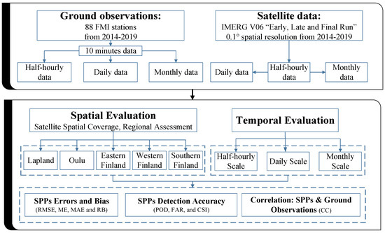 This section explains the procedure that was used to evaluate the accuracy of the post- and near-real-time IMERG SPPs. The following subsections provide details of the procedure, and Figure 5 at the end of the section summarizes the implemented procedure.