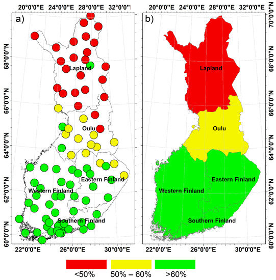 Several factors control the climate of Finland, typical examples of which are longitudinal gradient, maritime climate from Eurasia, the Scandinavian mountain range, and the Baltic Sea [52]. The Köppen–Geiger climate classification categorizes Finland as a cold climate region with no dry season, with cold summers in almost all of the country and warm summers in a small coastal area in southern Finland [54]. Southwestern Finland is familiar with a thermal winter season that lasts on average 14 weeks, while in northern Finland, thermal winter is almost twice as long. Moreover, the permanent snow season is about 22 to 27 weeks long [53,55]. In terms of watersheds, it can be said that Finland is the home of three categories of watersheds: those characterized by a multitude of lakes in the central part of the country; small and medium-sized coastal rivers; and large and medium-sized rivers of northern Finland (Figure 1b). The central part of Finland is mostly covered by lakes. It is estimated the thousands of lakes in this part of the country cover about 10% of the total area of Finland [56].