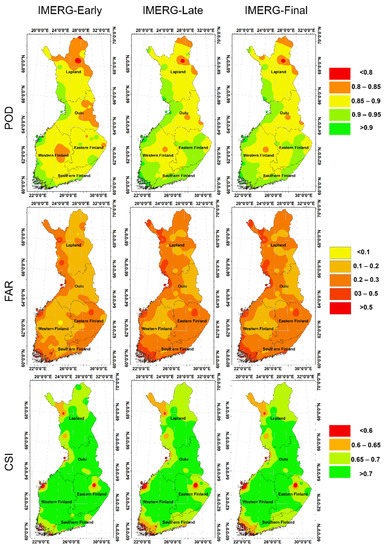 POD ranged from 0.8 to >0.9 for most of the regions (Figure 7). Eastern and Southern Finland showed the highest detection accuracy with a POD of more than 0.9. Oulu and Western Finland exhibited slightly lower detection accuracies with a POD of 0.85. Conversely, Lapland had relatively low detection accuracy—especially the mountainous region in Lapland—with more than 50% of the region exhibiting a POD of <0.85. With regard to the IMERG SPPs, IMERG-Late, and IMERG-Final showed a significantly improved detection performance compared with IMERG-Early for most of Finland.