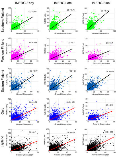 Scatterplots of gauge–IMERG correlation for each region in Finland: IMERG-Early, IMERG-Late, and IMERG-Final.
