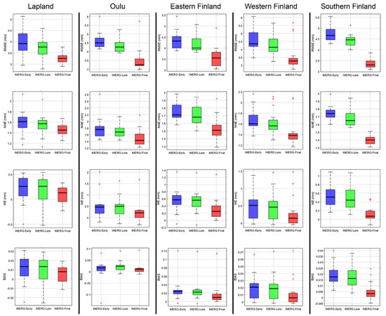 Errors associated with satellite precipitation estimates were evaluated according to RMSE, MAE, ME, and BIAS (Figure 9). The error indicators were applied to quantify the errors associated with each IMERG product over each region in Finland during the study period of 2015 to 2019. Overall, the calibrated SPP (IMERG-Final) had the lowest estimation errors than the near-real-time SPPs (IMERG-Early and IMERG-Late).