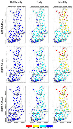 Spatial distributions of the half-hourly, daily, and monthly CC for IMERG-Early, IMERG-Late, and IMERG-Final.