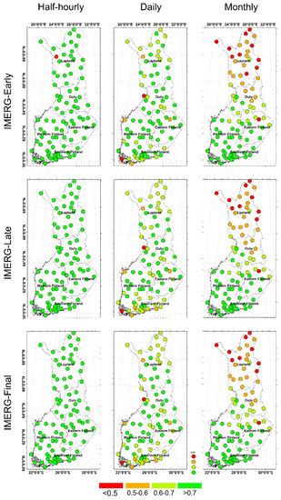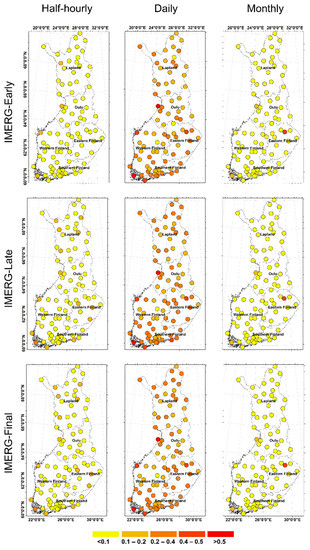 CC was used to evaluate the consistency between the rain gauge observations and SPPs at different temporal scales (Figure 13). CC showed almost no difference between the near-real-time SPPs (IMERG-Early and IMERG-Late) and calibrated SPP (IMERG-Final), but CC clearly differed depending on the temporal scale. With the half-hourly dataset, CC was lowest with an average range of 0.3–0.4 for most FMI stations spread across the country. With the monthly data, CC improved to 0.5–0.6 for most stations, except for 10% of the stations in the southern area, which had a very low CC of <0.3. With the daily dataset, CC was much higher at >0.6 for around 90% of the FMI stations.