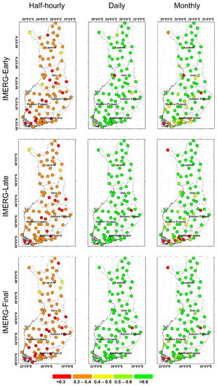 The poor performance at the half-hourly temporal resolution indicates that any slight difference between the ground measurements and satellite estimates would reduce CC. In addition, dealing with a large number of data can result in a large accumulation of differences, which can affect the sensitivity of the performance measure. This interpretation also applies to the monthly resolution because the aggregation of fine-resolution precipitation data to the monthly timescale would certainly result in a high propagation error for the satellite precipitation estimates.
