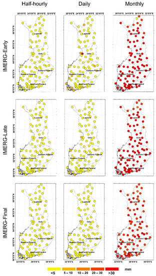 The temporal assessment showed that all IMERG SPPs had a high detection accuracy at different temporal scales. However, the half-hourly dataset resulted in the highest detection accuracy, whereas the daily dataset resulted in the lowest estimation error and highest correlation between the satellite estimates and ground observations. Thus, the daily IMERG datasets are recommended for detecting precipitation over Finland. Similar results were obtained by Asong et al. [66], who conducted a study over Southern Canada using two datasets. They found that the precipitation detection accuracy was high for both datasets; however, the error was lower, and correlation was higher in the case of the daily dataset than in the case of the 6-h dataset.