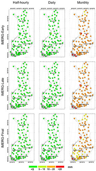 RMSE, MAE, and BIAS were used to evaluate the errors of the IMERG SPPs at different temporal scales. The IMERG SPPs did not show significant differences when compared at the same temporal resolution. Interestingly, the error associated with the satellite estimates was found to be insignificant. With the half-hourly dataset, RMSE was 0.24–0.44 mm for IMERG-Early and 0.2–0.4 mm for IMERG-Late and IMERG-Final (Figure 14). With the daily and monthly datasets, RMSE was 2.5–4 mm and 20–40 mm, respectively. When data are aggregated from a fine resolution (e.g., half-hourly) to a coarse resolution (e.g., monthly), the amount of error is generally expected to increase. Thus, the errors were evaluated on a relative scale. The monthly resolution resulted in the highest error with increased RMSE and MAE of >30 mm and 20 mm, respectively (Figure 14 and Figure 15). RMSE showed no significant differences between IMERG-Early and IMERG-Late. However, IMERG-Final showed a slight improvement (20% reduction in errors) compared with the near-real-time SPPs with an average RMSE of 2 mm for most parts of the country at a daily temporal resolution. MAE showed similar results as RMSE, except that IMERG-Final outperformed the other SPPs for the three temporal datasets with an error reduction of more than 30%. The BIAS results indicated that the SPPs tended to slightly overestimate the precipitation at the half-hourly and daily scales by 0.03% and 1.5%, respectively (Figure 16). In contrast, the SPPs underestimated the precipitation with an average BIAS of 18% at the monthly scale.