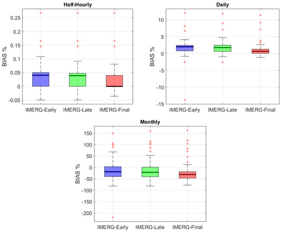 Half-hourly, daily, and monthly BIAS for IMERG-Early, IMERG-Late, and IMERG-Final.