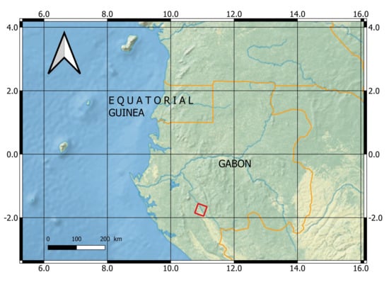 Geographical location of the test site in Gabon. A red rectangle indicates the particular area chosen for the present study. The map was made using Natural Earth. Free vector and raster map data can be found at naturalearthdata.com (accessed on March 2021).