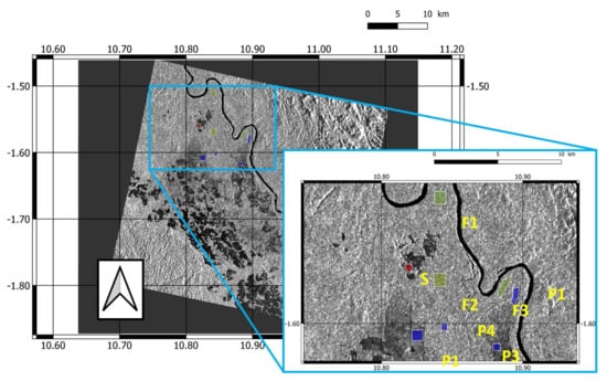 Zoomed view of the test site. A VV channel image acquired on 14 April 2015 and the polygons chosen for the analysis are shown. Labels F1, F2 and F3 refer to tropical forest areas; P1, P2, P3 and P4 to oil palm plantations; and S to savannah.