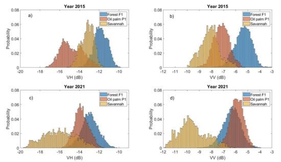 Figure 4 shows the histograms for forest, oil palm and savannah polygons (labeled as F1, P1 and S) for the first and the last images (i.e., 2015 and 2021, respectively). They are employed here to illustrate the statistical behaviour of all classes. The rest of the histograms are not shown here, since they do not provide additional information as they represent similar distributions, being the average value of VH and VV backscattering the remarkable difference to be accounted for.