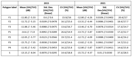 Statistics of all polygons for the initial and final images during the wet season (2015 and 2021, respectively). Mean values are expressed in dB in order to ease comparison with the reported values in the time series.
