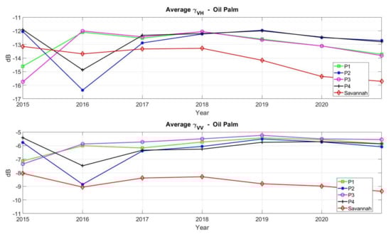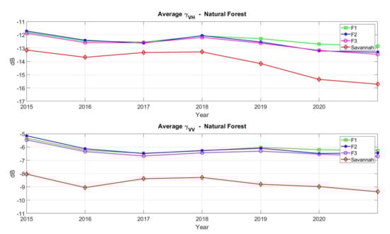 The time series of the mean backscattering values for VH and VV channels and all classes are plotted in Figure 6 and Figure 7. Both forest and oil palm time series for all available polygons are plotted together with the savannah time series. In the case of forests, both VH and VV backscattering maintain reasonably constant levels along the whole period. However, the first and last images (i.e., 2015 and 2021, respectively) show a slightly noticeable variability, contributing to enlarge the dynamic range to 1–1.5 dB, being the variations of environmental conditions a possible explanation. It is noted, however, that these backscattering levels exhibit very similar values to those reported in a number of previous works at C-band [8,12,29,30]. These values are also higher than from the low and sparse vegetation characterising savannah areas, especially for VV channel.