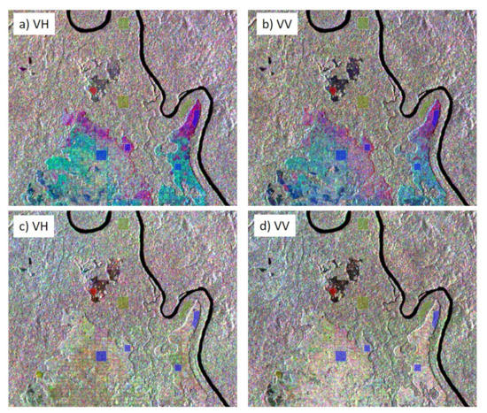 Temporal RGB compositions during the wet season of the zoomed view in Figure 3: (a) VH channel combining 2015 (R), 2016 (G) and 2017 (B); (b) VV channel combining years 2015 (R), 2016 (G) and 2017 (B); (c) VH channel combining 2019 (R), 2020 (G) and 2021 (B); and (d) VV channel combining 2019 (R), 2020 (G) and 2021 (B). Red, light green and blue polygons indicate the areas under study.