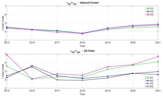 It is worth noting that the VV/VH ratios for P1–P3 oil palm polygon as well as those for forests reach very similar values to those reported in [8] (see histograms in Figure 6 therein). In particular, the C-band VV/VH histogram for oil palm parcels reported in [8] exhibits a bimodal distribution, being their maxima at about 4.5 and 6.5, respectively. The explanation for this behaviour is perfectly compatible with the fact that the chosen area in [8] contains sub-areas with oil palms at different growth stages, as occurs in our case when comparing polygons P1–P3 and P2–P4 (see VV/VH values in 2021 in Figure 7). This result seems to constitute additional evidence of the capability of C-band VH and VV polarisations for discriminating between tropical forest and oil palm plantations.