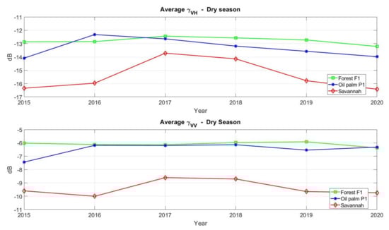 We replicated the same procedure as for the wet season to extract the backscattering time series during the dry season for representative polygons F1, P1 and S. The resulting signatures are compared to the ones acquired during the wet season. Figure 10 illustrates the VH and VV backscattering signatures for all three polygons. Comparing these plots to the corresponding ones in Figure 6 and Figure 7, the general trends described for the wet season appear again (i.e., increasing and decreasing trend in VH and a higher stability in VV), but a more stable behaviour is exhibited for both forest and oil palms. In the case of forest, the only date where a decrease in the dry season appears with respect the wet one is in 2015 for both channels with roughly 1 dB, being this effect consistent with the absence of rain events and the lower moisture of vegetation. In the case of the oil palm scenario, a similar qualitative behaviour is exhibited for both VH and VV channels where slightly lower power levels are retrieved for the dry season along the whole period except for the 2015 acquisition. In addition, the dynamic margin for the savannah area remains similar when comparing both seasons (i.e., slightly lower than 3 dB in both cases), displaying variations more similar for the VV channel than for the VH one.