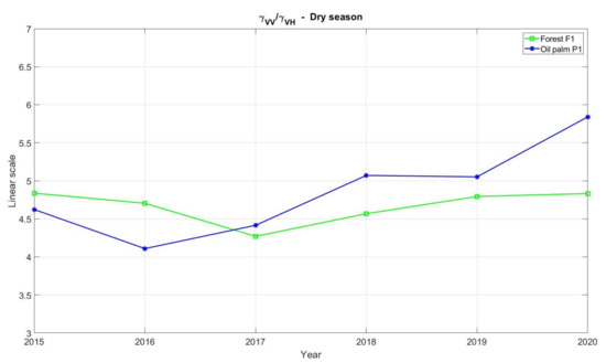 The VV/VH ratio was also computed for this season, as shown in Figure 11. Nearly the same signatures as for the wet season (Figure 9) were obtained. The ratio for forest area again remains between values 4 and 5, whereas the ratio for oil palm follows an increasing trend due to the plants development reaching a value of 5.84 for the last image acquired in July 2020, which seems consistent with the pattern shown for the wet season ending later in February 2021 (see Figure 9).