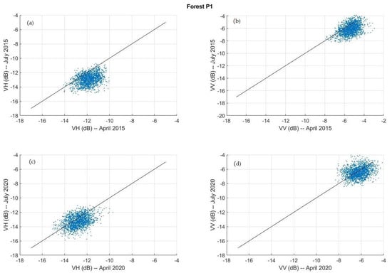 The scatter plots of backscattering values for the wet and dry seasons were also computed. Figure 12 and Figure 13 show these plots for 2015 and 2020. The most relevant differences appear in the case of forest when comparing wet and dry seasons for 2015, where a lower backscattering is detected in the dry season, in agreement with the previous analysis on the time series. In the case of oil palms, the VH channel is the one exhibiting a higher sensitivity to environmental changes between wet and dry seasons, as shown in Figure 13a,c. It must be noted, however, that the use of VV/VH seems to reduce these backscattering variations, as shown in Figure 9 and Figure 11.