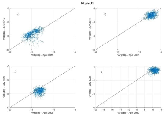 It is noted that the present analysis was firstly focused on the wet season. Later, a comparison to the measurements during the dry season was also considered (see Section 3.3). After a first pre-screening of radar images, we identified some oil palm areas where the plantation was delayed with respect to other areas. This fact allowed selecting two different pairs of areas with one-year delay in the plantation. Among all four oil palm areas (i.e., P1–P4), we selected those labelled as P1 and P3 since they exhibited radar signatures typical of bare surfaces for the 2015 image. Whether they had been cleared around the acquisition date or the palm trees had just been planted is unknown to us. Fortunately, this fact does not prevent the sensitivity analysis as the radar signature corresponds to a dominant bare surface. Likewise, polygons labelled as P2 and P4 correspond to parcels which were cleared after the 2015 image but before the 2016 acquisition. This plantation delay manifested itself in the radar signatures by means of a time shift between P1–P3 and P2–P4 parcels.