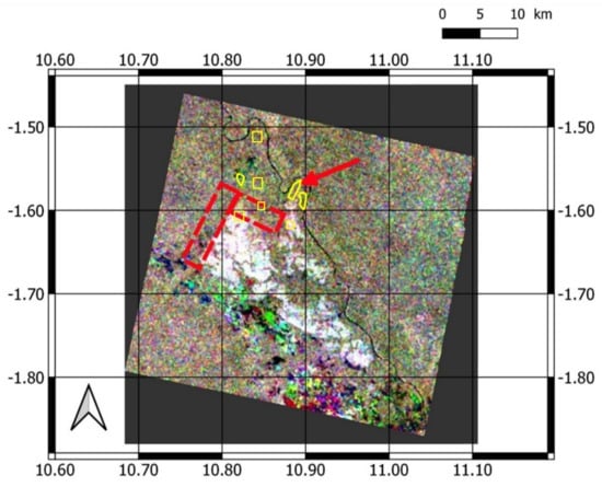 - Subset the images. The latitude interval was set from 1.46° S to 1.87° S and the longitude interval from 10.75° E to 11.04° E. Hence, the covered area is around 40 × 37 km (see Figure 3).